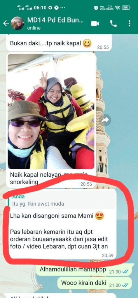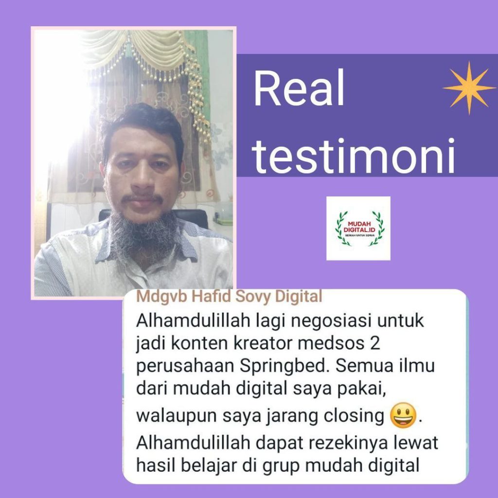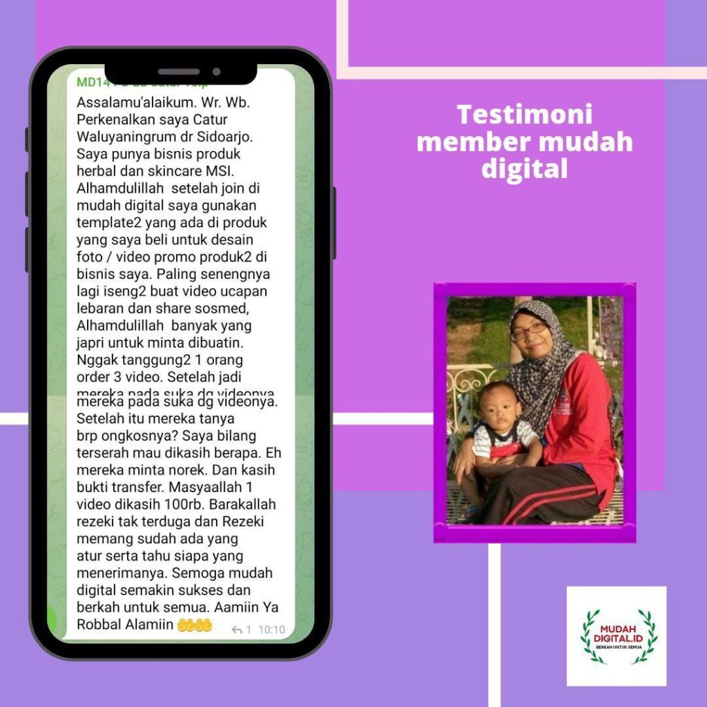 Ada juga contoh , mbak catur, seorang ibu rumah tangga , seorang pebisnis MLM ,rajin ikut affiliator mudah digital , ALHAMDULILLAH tiap proyek dapat closingan , dapat komisi ,masih dapat pula dari jasa orderan design ,jadi bertubi tubi sumber penghasilan yg beliau peroleh